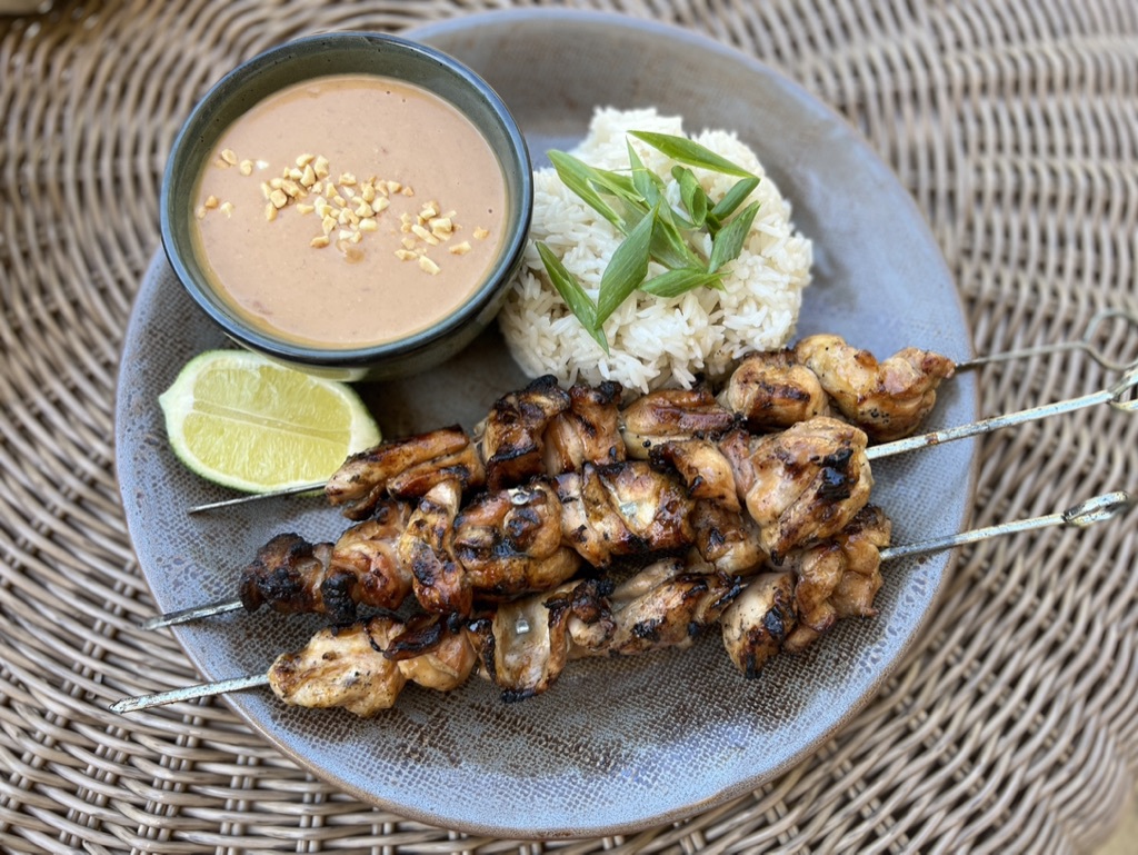 Cook the chicken skewers over the direct coals for 2-3 minutes, then flip and cook a further 2-3 minutes on the other side. The chicken should have nice color and char, but not be burnt.