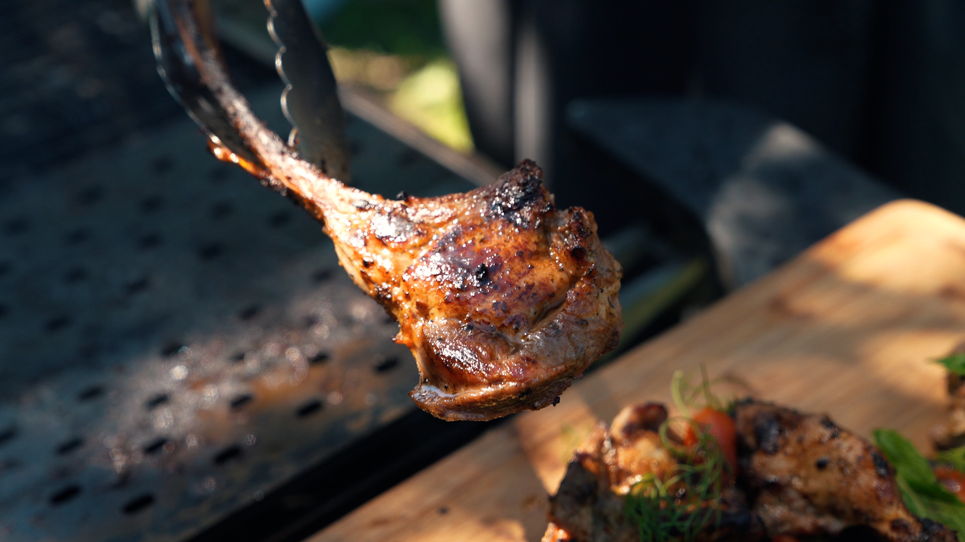 Next, stoke the fire to make sure it's quite hot. Wipe most of the marinade from the chops and grill for about 3–4 minutes per side—maybe a little longer—until really browned and charred all over, especially the meaty rib bones. As they’re done, place them on the platter. Garnish with the parsley and mint and serve quickly so your guests can burn their fingers.