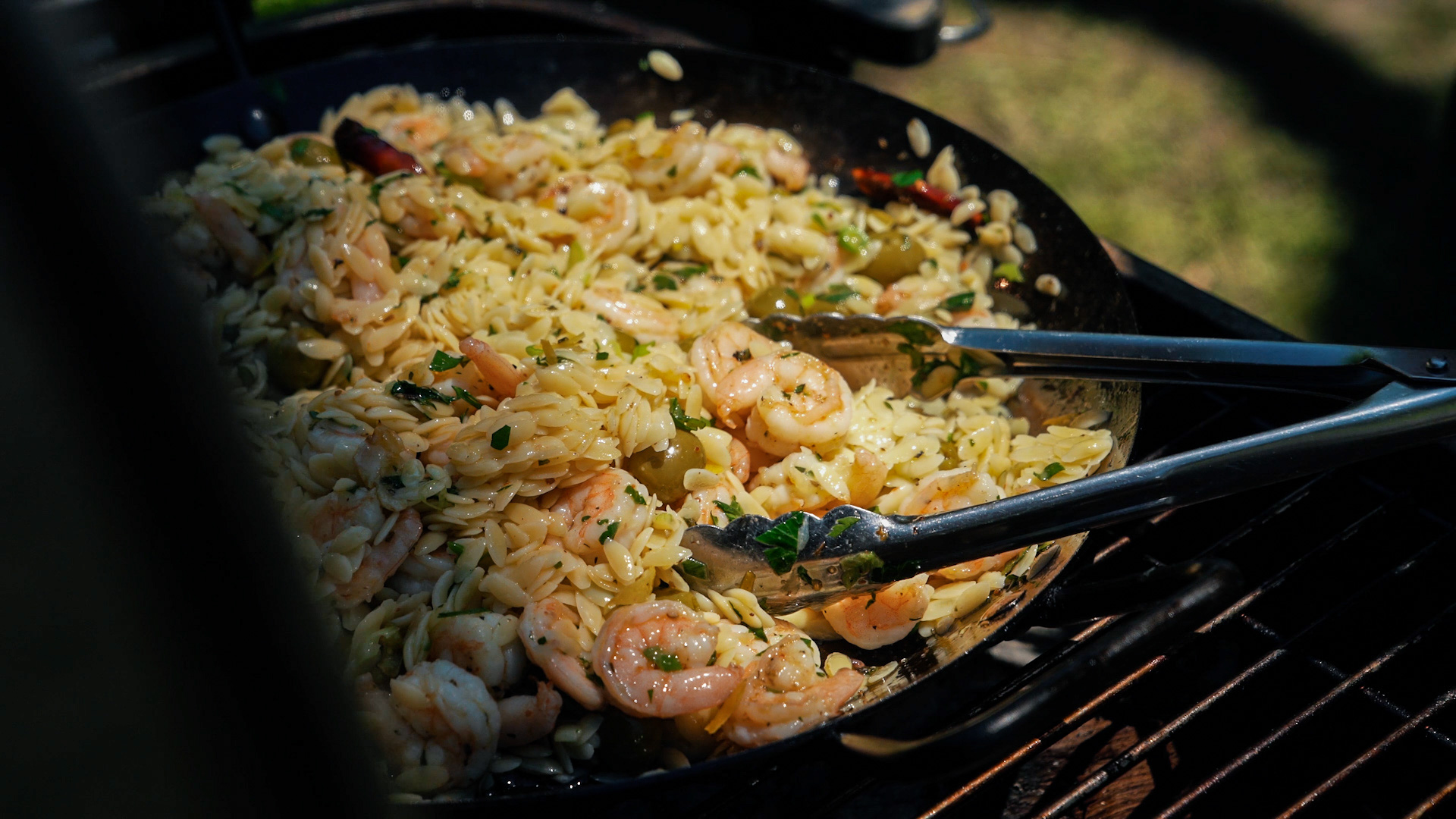 While the grill heats, bring a large pot of generously salted water to a boil over high heat. Add the orzo and cook according to the package instructions until al dente (tender but still firm). Drain the orzo in a colander, rinse it briefly, then transfer it to a mixing bowl. Drizzle the pasta with enough olive oil to lightly coat and toss to combine (this will help prevent the pasta from sticking).